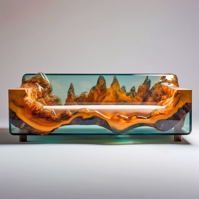 • Topographical Timber Inlay: Features hand-carved wood “peaks” suspended in deep resin.