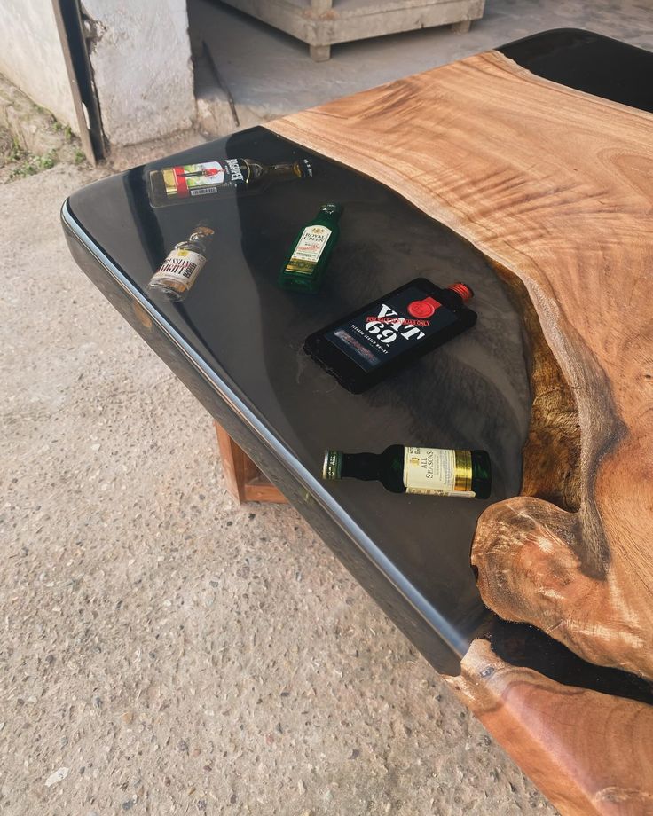 Curated Bottle Inlay: Features iconic miniature spirit bottles suspended within deep, translucent black resin for a unique, high-end bar or lounge aesthetic.