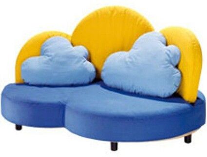 Create a cozy cloud-themed space with this blue sofa featuring rounded cloud-shaped back cushions in blue and yellow. It is supported by short, stable legs.