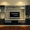 • Dual Drop-Front Base Cabinets: Outfitted with two wide, seamless cabinets featuring smooth drop-down doors for discreet storage of media accessories while maintaining a clean silhouette.