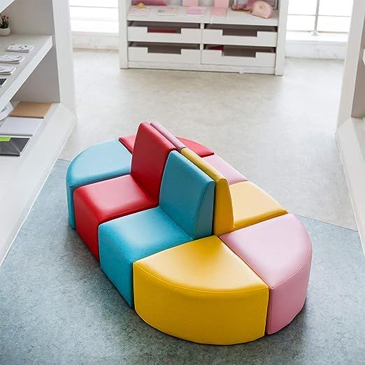 Spark creativity with the Play Patch Modular Seating Set, a versatile furniture collection designed for dynamic playrooms and classrooms. This multi-piece set includes vibrant, cushioned chairs and wedge-shaped ottomans that can be arranged into a central circular hub, a long reading bench, or individual social stations. Its lightweight design and rainbow palette make it an engaging centerpiece for any kid-focused environment.