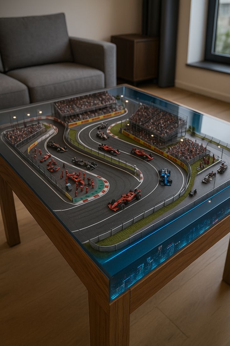 • High-Fidelity Racing Circuit Inlay: Showcases a meticulously detailed 3D track with realistic textures, pit crews, and miniature racing cars suspended in optical-grade resin.