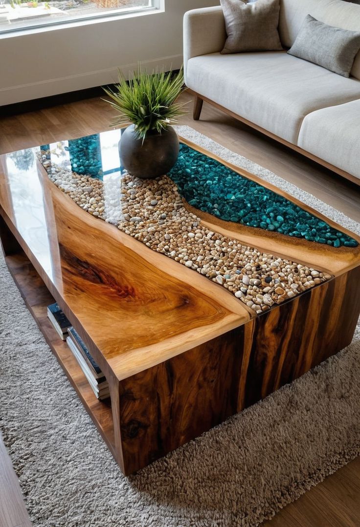 Dual-Zone Topography: Showcases a unique transition from genuine earth-toned river stones to vibrant teal-pigmented resin, creating a realistic shoreline effect.